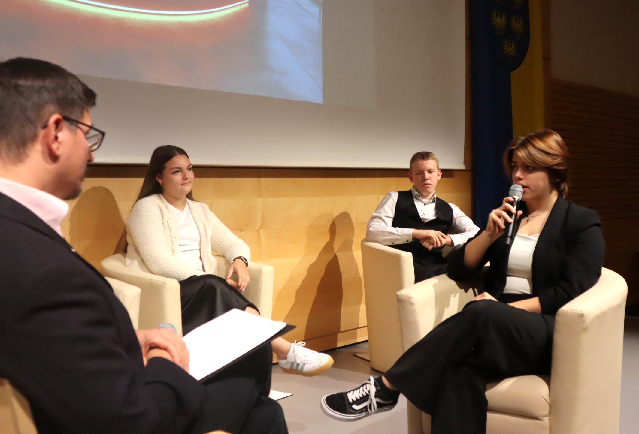 Was haben Mandarinen, Kanalgeruch bei Oma zuhause und die Pausenzeiten gemeinsam? Sie waren hochdiskutierte Themen bei der lebhaften Podiumsdiskussion der Schülersprecher-Kandidaten. Karin Buchberger, Anja Größbacher, Flora Masching, Theo Trauner und Celina Zierhofer stellten sich zahlreichen Fragen. Das Quintett hat sich dabei wacker geschlagen und man darf auf die Wahl nächste Woche gespannt sein. Organisiert und moderiert wurde die Diskussion in bewährter Manier von Armin Haiderer und Florian Hartl.